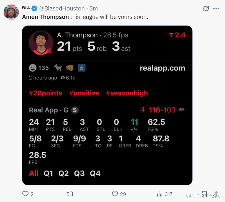 BiasedHouston, a media outlet, published Amen's data and wrote: He will be able to dominate the league in a short time. (Amen’s three preseason games: 11+3+2, 19+7+6, 21+5+3)