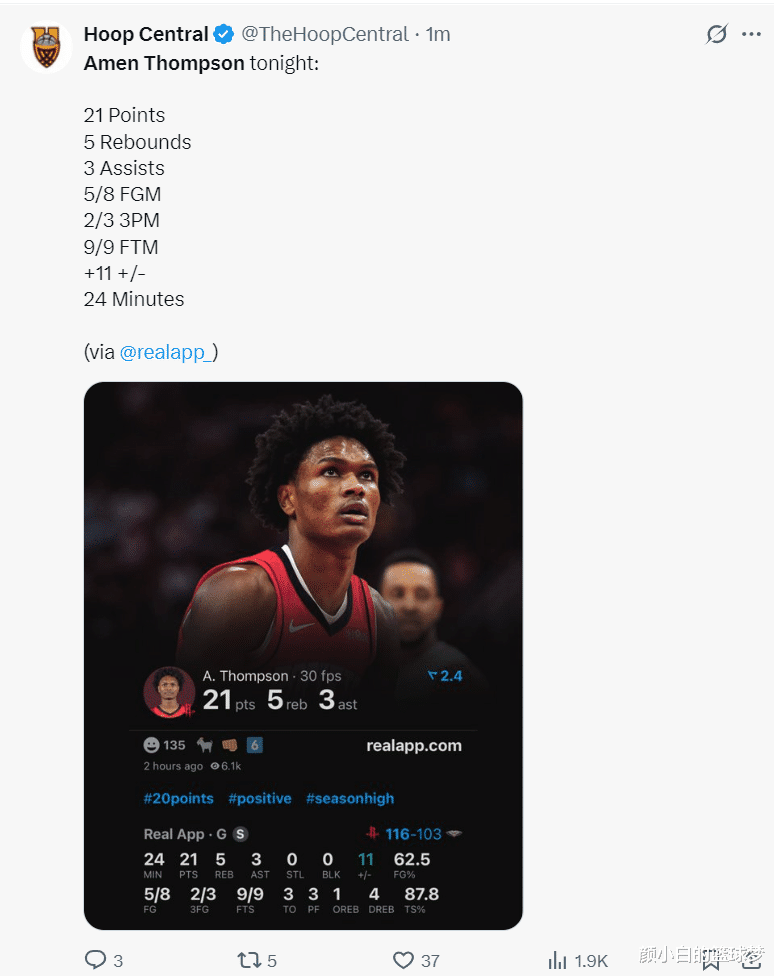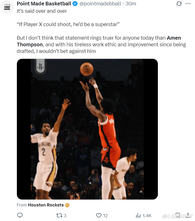 US media PMB: I have always said that if Amen can practice shooting, he will become a superstar in the league. His unremitting efforts are touching. He has been improving since he joined the Rockets. I think Amen will succeed.