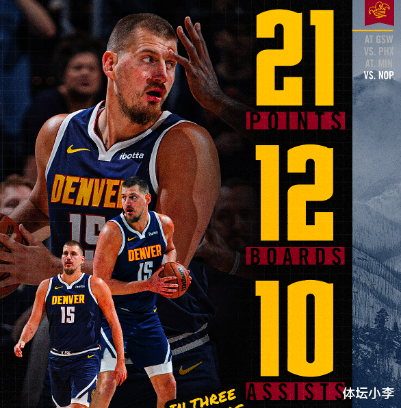 After the Nuggets lost the opening game, the team quickly adjusted, and Jokic also became more efficient. This time he got a triple-double in 10 of 15 games. This was also the triple-double he had in 4 consecutive games at the beginning of the season, tying the most in history and tied for first place in history. If this momentum continues, there will be no problem in surpassing it.