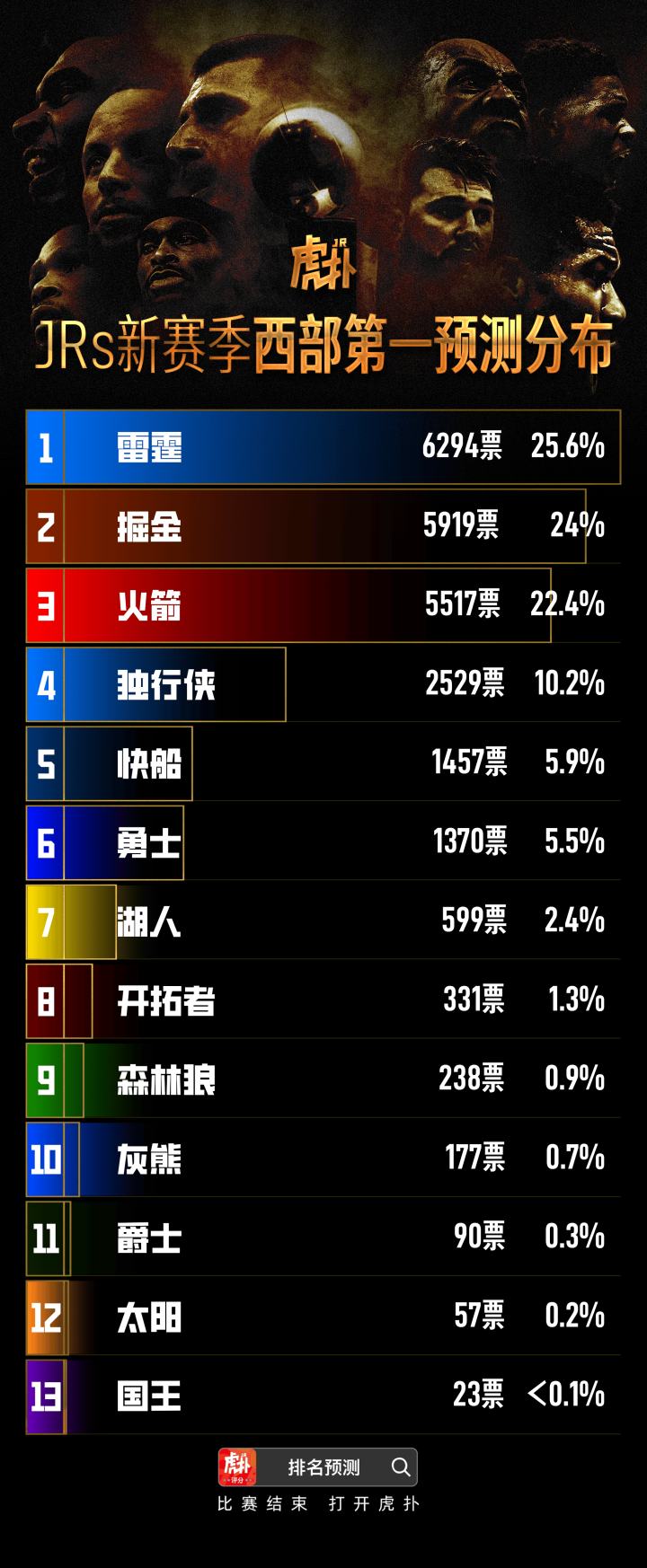 On the occasion of the opening of the new season, we have collected all the voting data from the event so far, and sorted out 24,565 valid votes, and obtained the top ten teams in the East and West predicted by JRs for the new season: