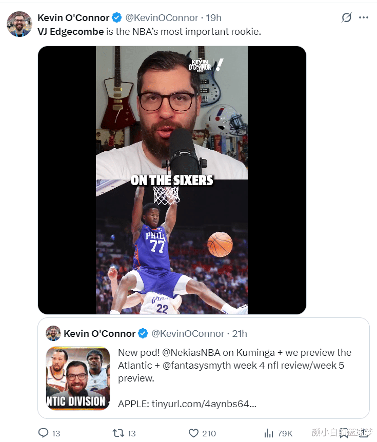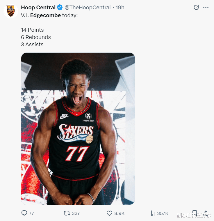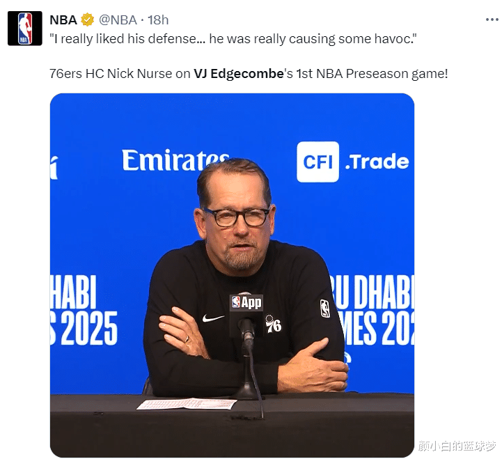 Philadelphia reporter Sean Barnard wrote: The first game of the NBA's new season almost showed a dunk. I am no exaggeration to say that Edgecom will become the top 10% of NBA talent.