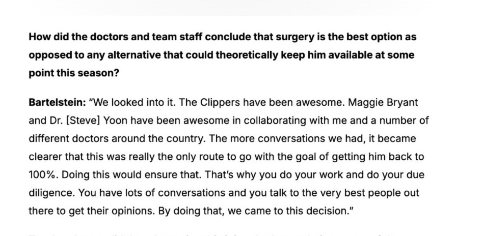 Bill's agent revealed the details of the communication with the Clippers team doctor. He said: We have carefully studied it. The Clippers are very good. Maggie Bryant and Dr. Yin (Steve Yin) have discussed it with me and many doctors across the country. They have all discussed very well. The more time we spent, the clearer it became that surgery was the only way to get him back to 100%; we had a lot of discussions, talked to the best experts in the industry, and listened to their opinions, which led us to this decision.}Bill's agent also said: This is really a great organization, and everyone on the team is dedicated to the players. The Clippers' medical team's care for the players, their attention to details, and their approach of always putting the interests of the players first can be said to be the best in the industry.