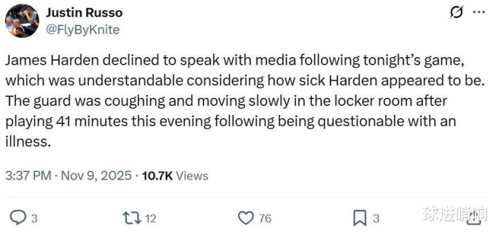 After the game, ship reporter Justin Russo said that Harden refused to be interviewed because the latter looked very ill, coughing in the locker room and moving slowly, so it is completely understandable.