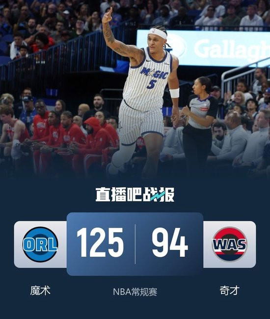 At the beginning of the game, both sides made repeated achievements on the offensive end and fell into a tug-of-war. The scores took the lead alternately. The Wizards entered the second quarter with a 3-point advantage. In the second quarter, the situation on the court suddenly changed. The Magic became more courageous and completed the lead. The team scored 42 points in a single quarter. The Wizards once fell into a scoring drought. The point difference gradually widened to double digits. The Magic ended the first half with a 75-56 lead. After changing sides and fighting again, the Magic continued to take the initiative on the court. The point difference always fluctuated around 20 points. At the end of the quarter, the Magic once again hit a 10-0 spurt to widen the point difference to 30 points. In the final quarter, the Magic played steadily and the point difference was no longer close. The game quickly lost suspense. In the end, the Magic defeated the Wizards 125-94 and won two consecutive games.