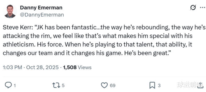 Faced with Kuminga's performance, Cole, who has always been very strict with him, couldn't help but praise after the game: "Kuminga is great! Whether it is rebounding or attacking inside, he has shown uniqueness with his athletic talent and strength. This performance not only improved his game level, but also changed our team."