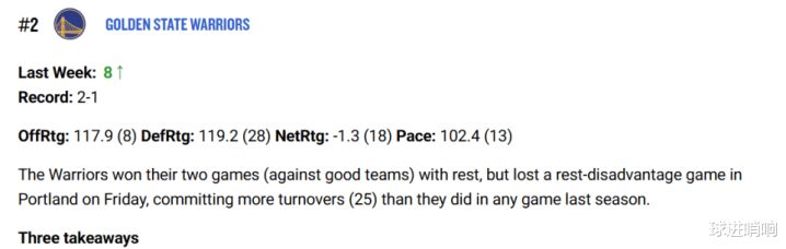 It is indeed reasonable to rank second in the strength list. The Warriors have proven themselves with 3 wins in 4 games! Four players scored 20+ points without Curry. Golden State has three killer moves to once again challenge for the championship.