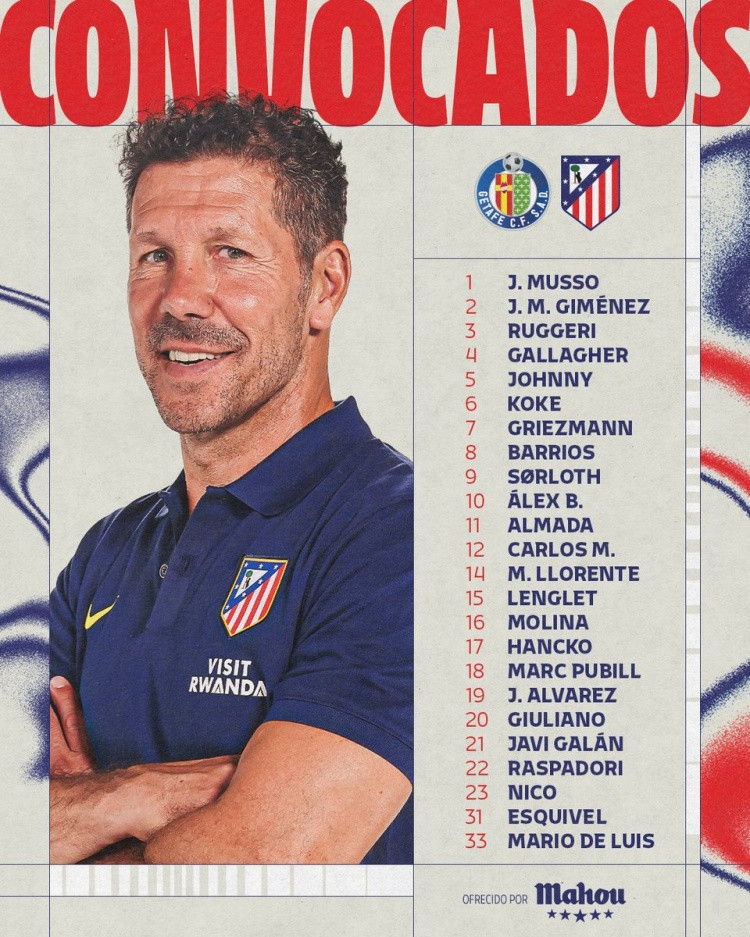 November 23rd, at 1:30 a.m. tomorrow, in the 13th round of La Liga, Atletico Madrid will play Getafe away. Atletico Madrid announced the team roster for this game.