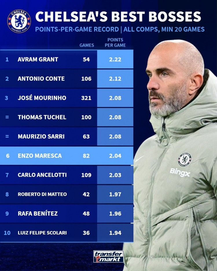 Chelsea team s historical average points per game: Conte and Mourinho ranked second and third, Maresca rose to sixth
