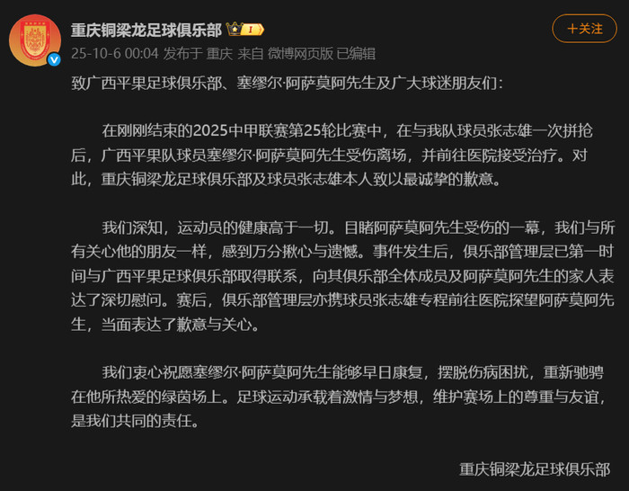 On October 6, Chongqing Tonglianglong Football Club apologized again on Weibo for causing the opponent's player to be injured during the match against Guangxi Pingguo Football Club, Mr. Samuel Asamoa and his fans: