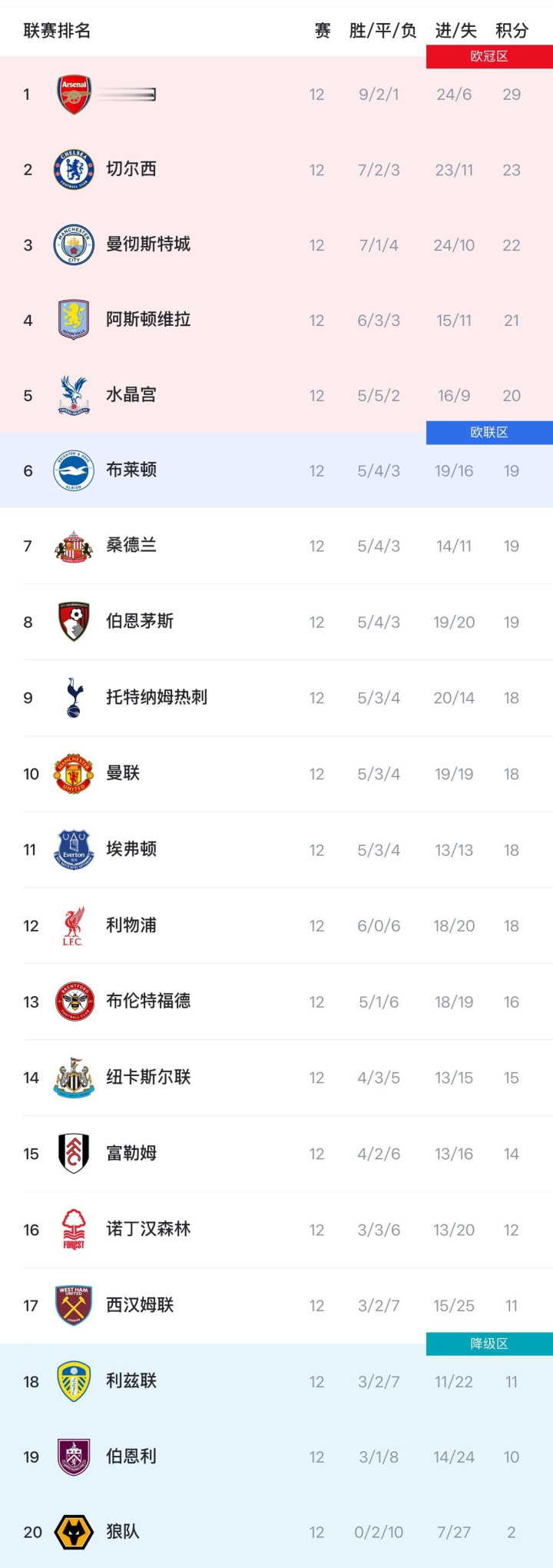 The competition in the lower half of the standings is also becoming increasingly fierce. Brentford ranks 13th with 16 points after 12 rounds, Newcastle ranks 14th with 15 points after defeating Manchester City, and Fulham climbed to 15th with three points over Sunderland. Nottingham Forest moved to 12 points after winning the Anfield battle, ranking 16th. West Ham United ranked 17th with 11 points, Leeds United ranked 18th with 11 points but fell into the relegation zone due to goal difference disadvantage, and Burnley ranked 19th with 10 points.