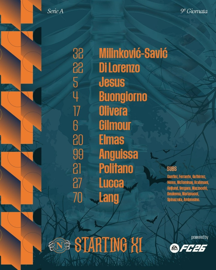 Naples substitutes: 14-Contini, 25-Ferrante, 3-Miguel Gutierrez, 7-Neres, 8-McTominay, 13-Rachmani, 19-Hoylen, 26-Vergara, 30-Mazzocchi, 31-Bekma, 35-Marianucci, 37-Spinazzola, 69-Ambrosino