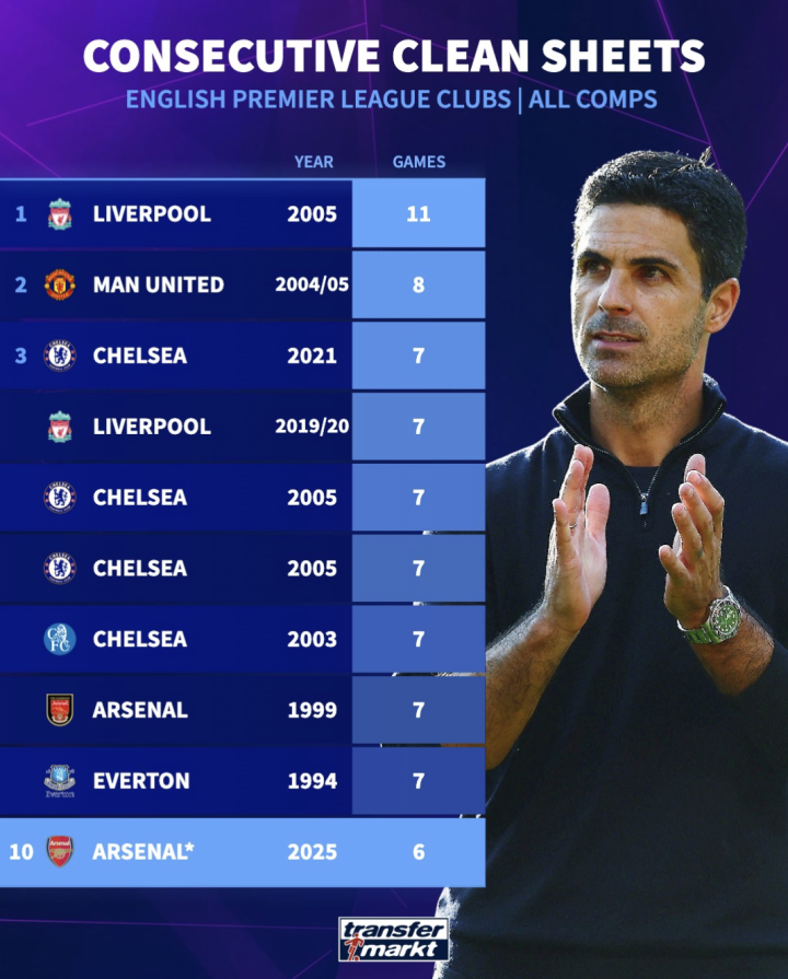 Liverpool topped the list with 11 consecutive clean sheets in all competitions in 2005, and Manchester United ranked second with 8 clean sheets in 2004/05. This season Arsenal has completed 6 games without a clean sheet and entered the top ten on the list.