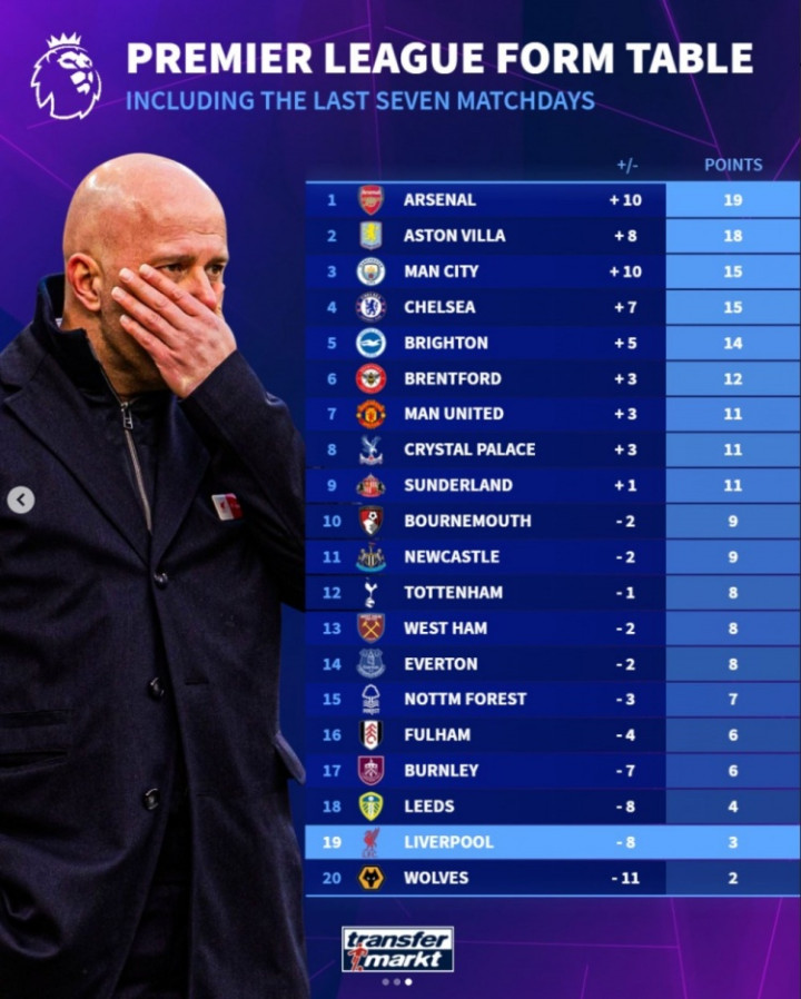 Scores of the Premier League teams in the last 7 league games: Arsenal leads the way with 19 points, Liverpool is second to last with only 3 points