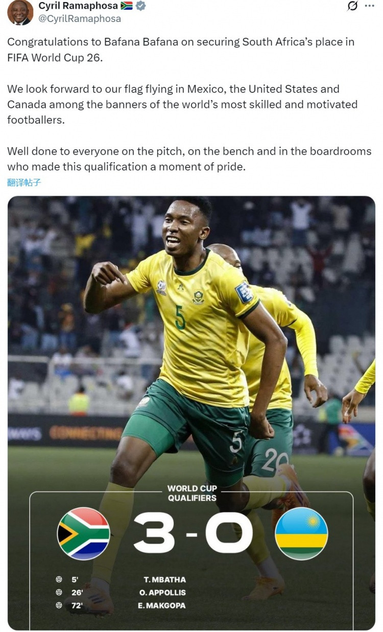 South African President Ramaphosa sent two tweets in a row to express his blessings to the South African team. The first tweet read: "We are entering the 2026 World Cup! Congratulations to all members of the South African national team. The entire South Africa will continue to support you all the way."