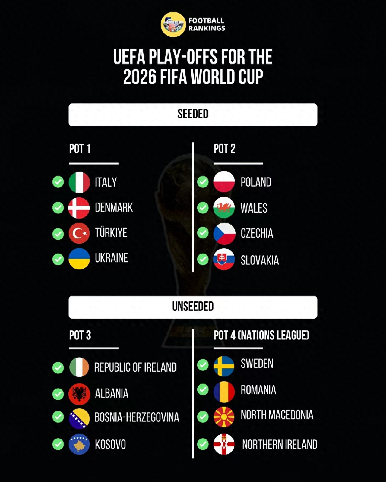 The European play-offs advance to 4 out of 16, with Italy in the first pot and its bitter hosts, Sweden and North Macedonia, in the fourth pot.
