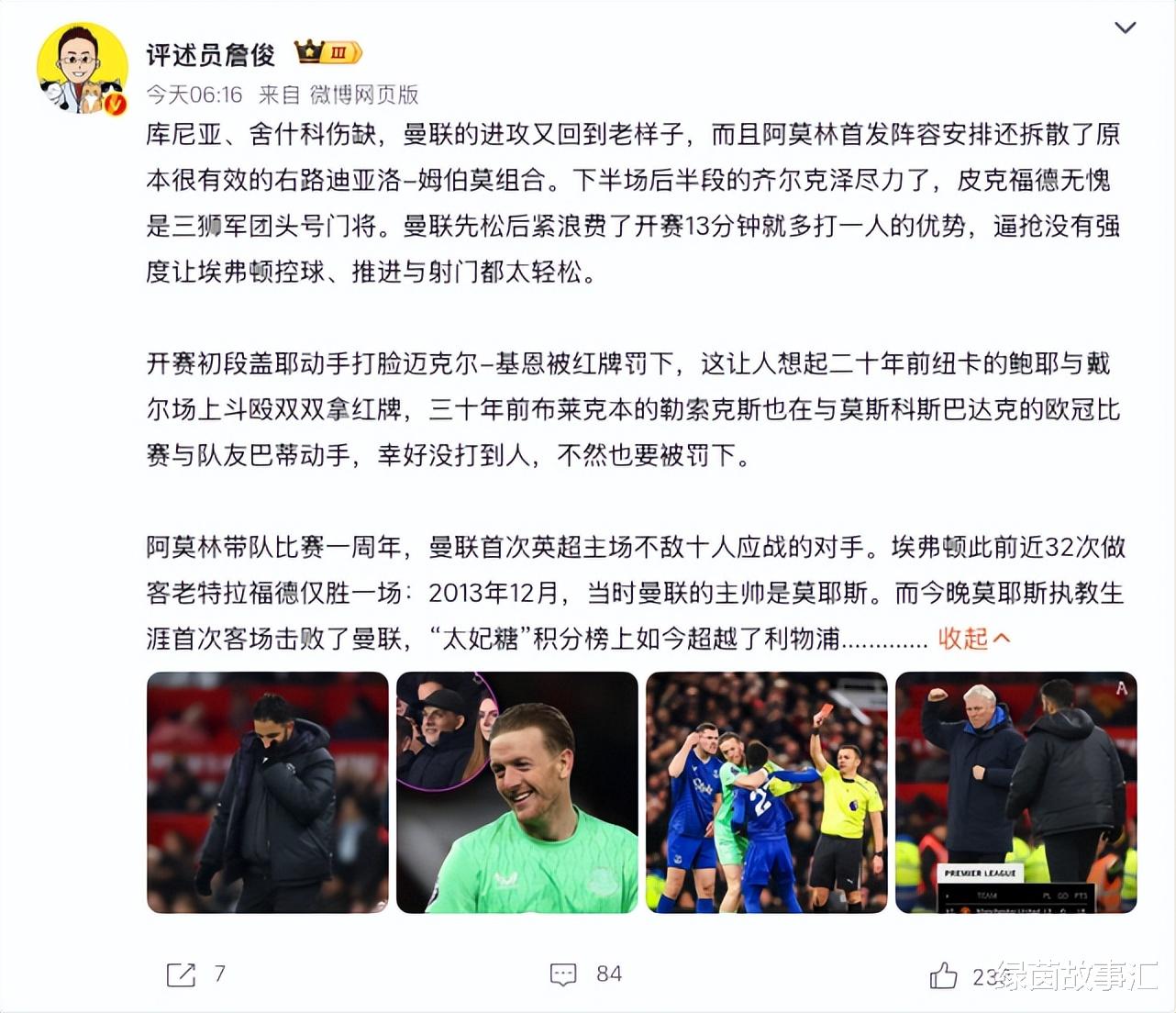 After the game, the famous football commentator Zhan Jun posted a post on social media to comment on Manchester United's performance. He wrote: "With Cunha and Sheshko injured, Manchester United's offense has returned to its old form, and Amorim's starting lineup also dismantled the originally effective Diallo-Mbemo combination on the right. Zirkzee did his best in the second half of the second half, and Pickford is worthy of being the number one goalkeeper of the Three Lions. . Manchester United wasted the advantage of having one more player in the first 13 minutes. The lack of intensity in the press made it too easy for Everton to control the ball, advance and shoot. "