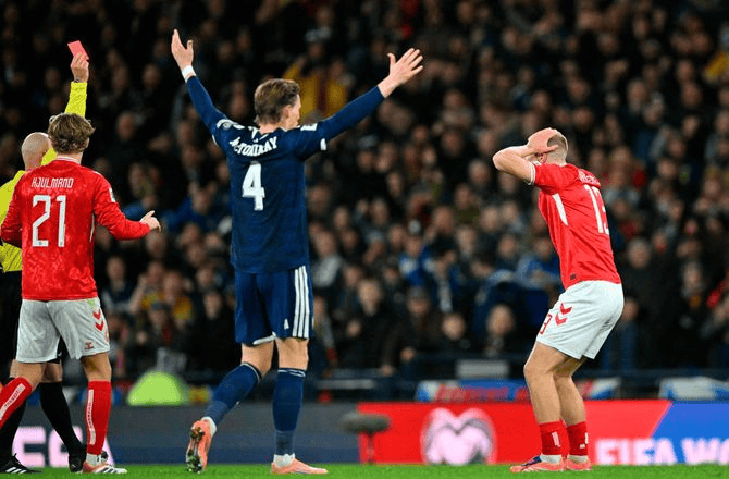 Hupu News November 19th In this key qualifying match between Denmark and Scotland, Rasmus Nissen-Christensen was sent off early with a red card, and the Danish team eventually lost 2-4.