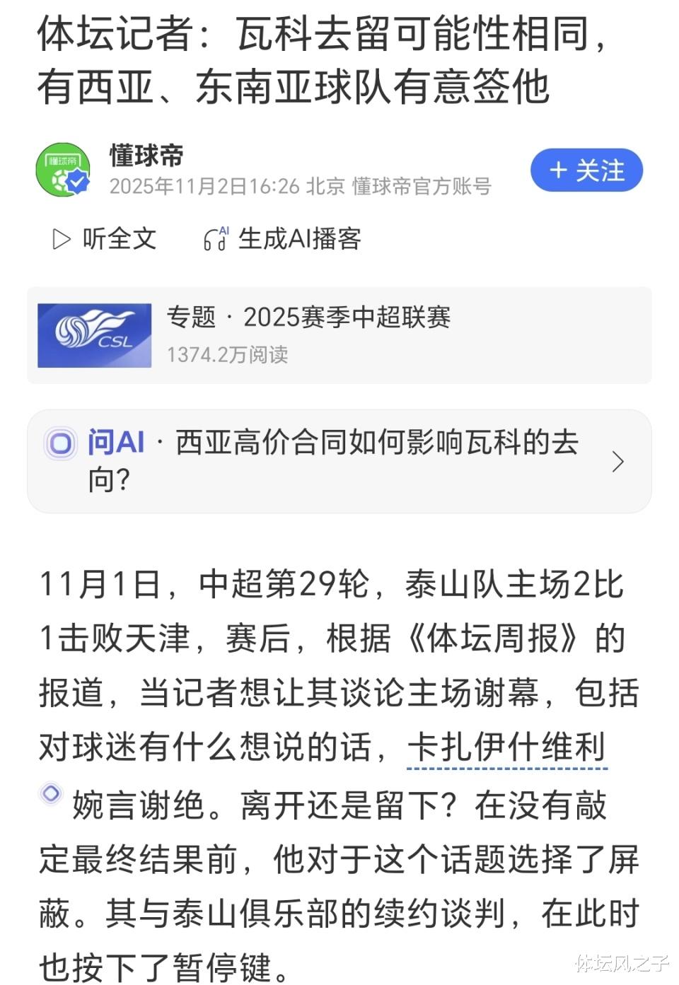 Judging from media reports, Kazaishvili had a clear attitude in the negotiations and accepted a salary cut, but he must sign a three-year contract. However, there is a big gap between this requirement and the expectations of the Taishan team. The Taishan team needs to comprehensively consider many factors such as the team's long-term planning, the rationality of the salary structure, and the actual contribution of the players, so it is difficult to accept his conditions. At present, Kazaishvili will most likely leave the Taishan team. No matter which team Kazaishvili plays for in the future, I hope he can maintain his peak condition for a longer time.
